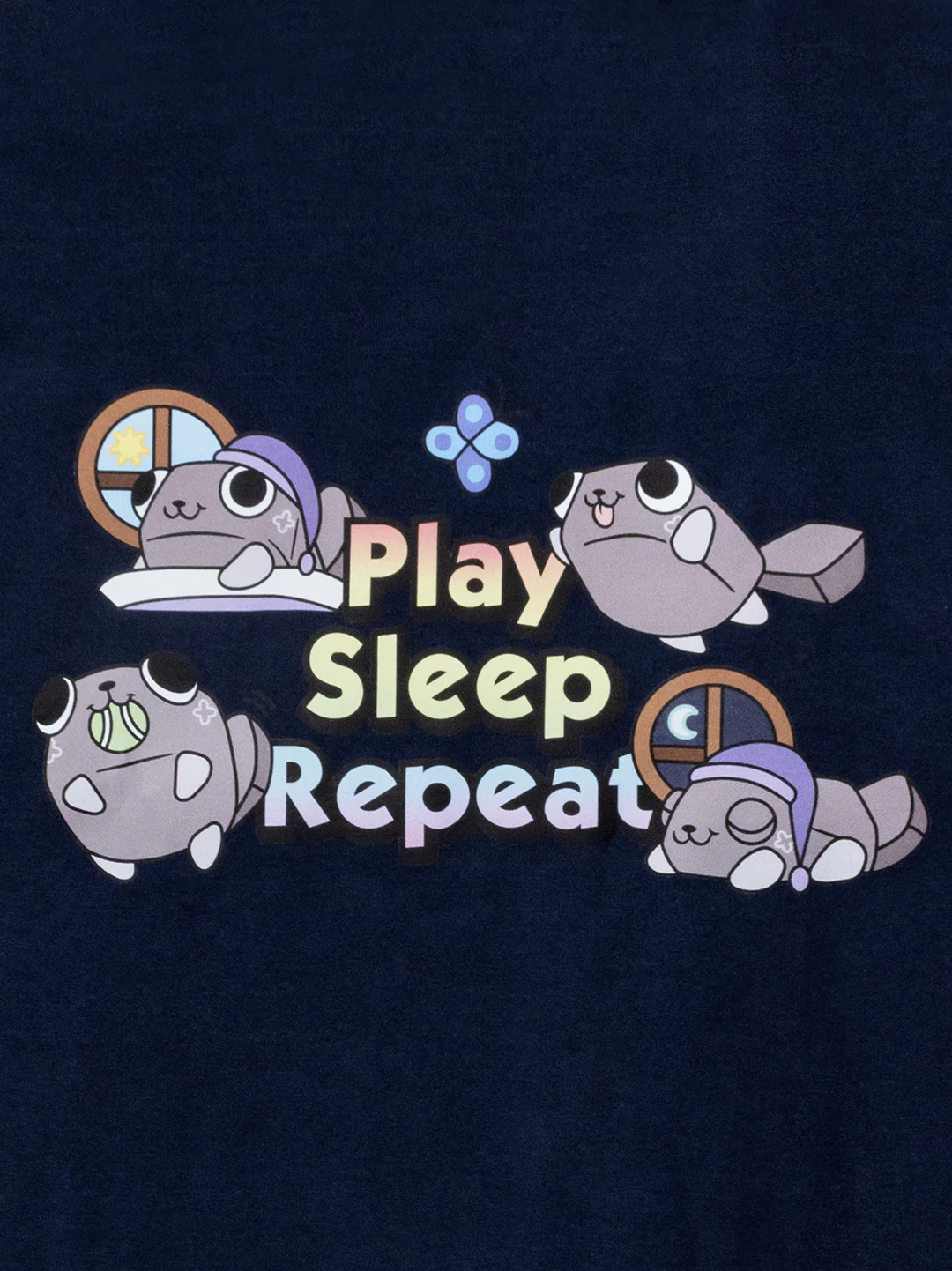 T-shirt of Pebble waking up, playing, and then falling back asleep. Play. Sleep. Repeat!